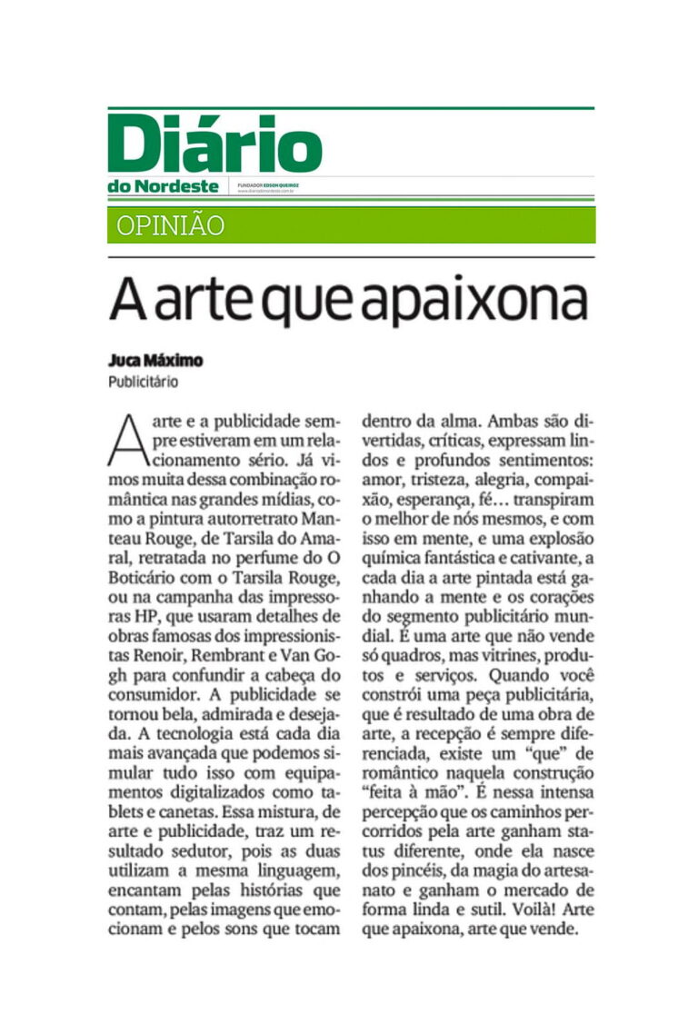 Um trabalho dramático e extremamente sensível. Esse é o conceito de Juca Máximo, artista cearense que vem se destacando na cena internacional com um estilo “expressionista contemporâneo”. O talento se dissemina por outros segmentos do setor criativo, assim, o artista…